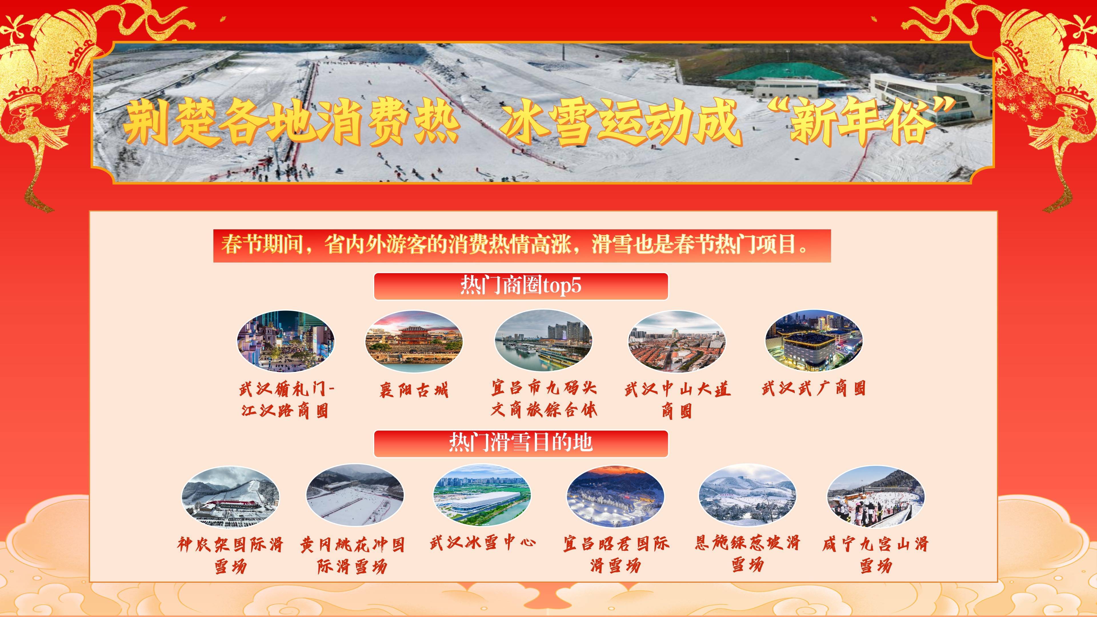 除了逛街,滑雪亦然春节热点姿色。神农架国外滑雪场、黄冈桃花冲国外滑雪场、武汉冰雪中心、宜昌昭君国外滑雪场、恩施绿葱坡滑雪场、咸宁九宫山滑雪场在大岁首三、初四迎来岑岭,冰雪认知成为新年俗。