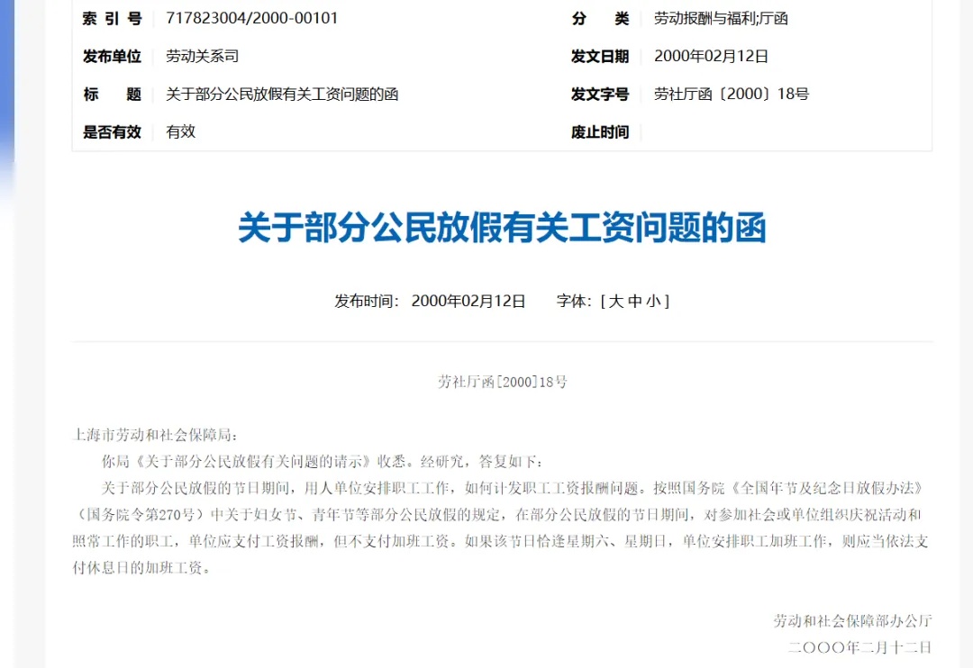 据《劳社厅函〔2000〕18号》文献端正,在部分公民休假的节日历间,对参加社会或单元组织庆祝活动和照常责任的员工,单元应支付工资报答但不支付加班工资。