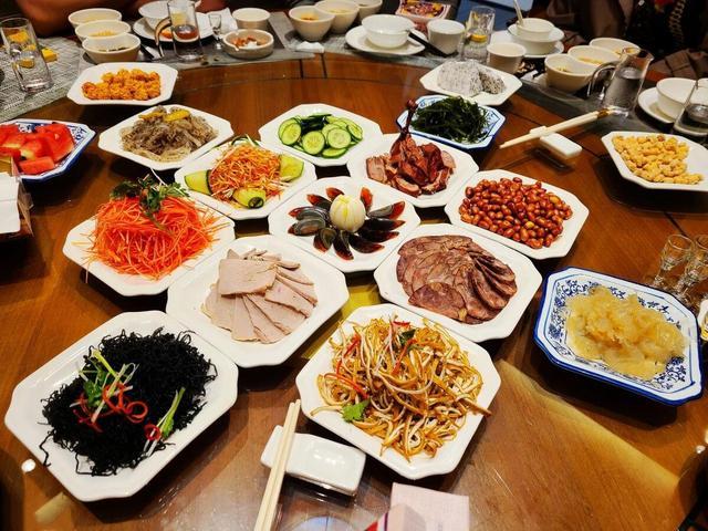 最初上来十三个凉菜,那即是“十三花”。最具代表性的有水磨丝、油炸豆腐丝、麻酱精肉、白膘肉片,配以油炸花生米、五香花生米、醉枣、炝莲菜、牛肉、蹄筋、温拌腰花、油炸鲫鱼......
