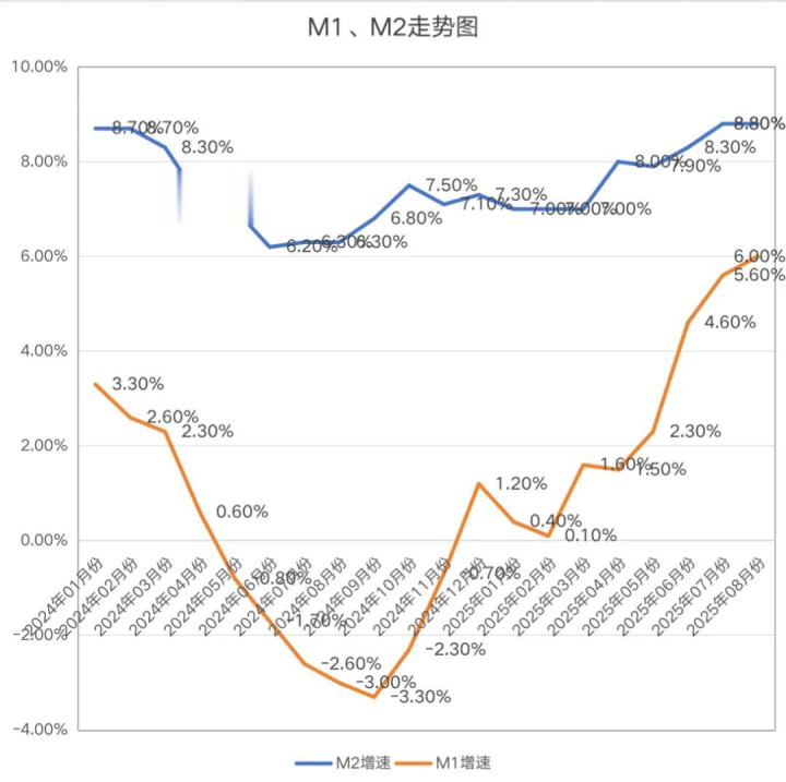 8月末,广义货币(M2)余额331.98万亿元,同比增长8.8%。狭义货币(M1)余额111.23万亿元,同比增长6%。