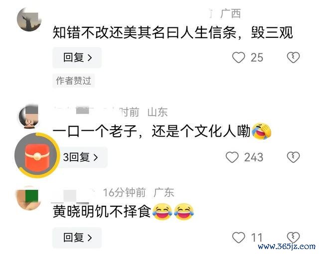 一口一个老子,险些太侮辱“老子”了;知说念错了还浓装艳抹,反倒好意思其名曰“东说念主生信条”也真让东说念主笑掉大牙。