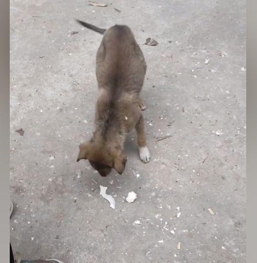 在小流浪狗吃完食盆里的剩饭后,女子叫住了它,又喂了它半个馒头,这下才果然吃饱了,朝着女子又蹦又跳了起来。