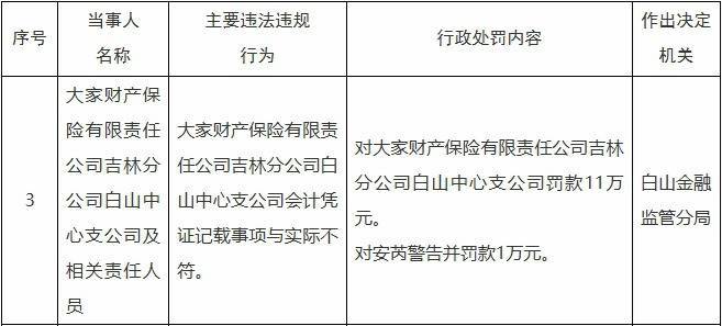 白山金融监管分局对大家财产保障有限包袱公司吉林分公司白山中心支公司罚金11万元;对安芮告戒并罚金1万元。
