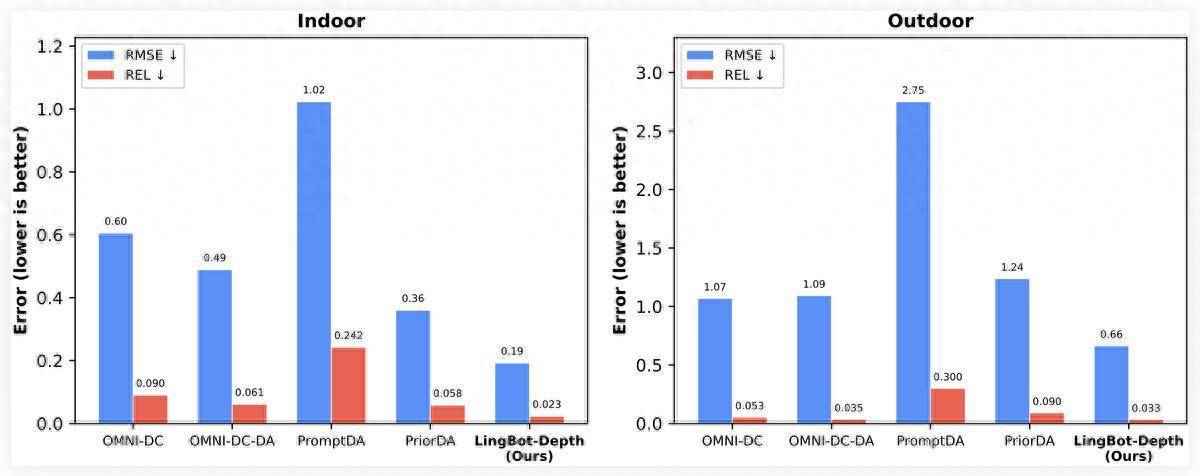 (图说:在最具挑战的寥落深度补全任务中,LingBot-Depth性能举座优于现存多种主流模子。图中数值越低代表性能越好。)