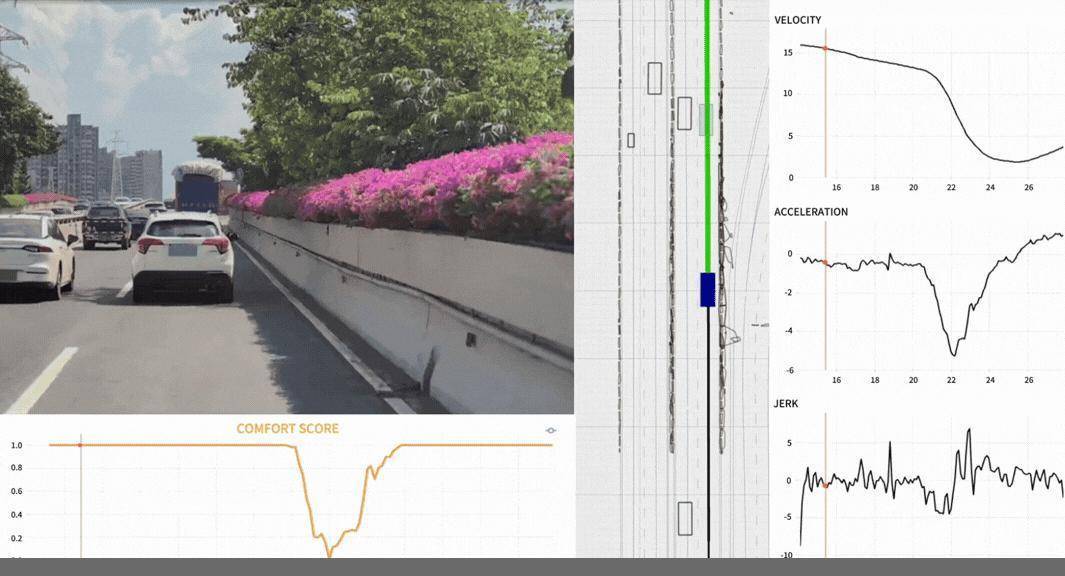 画面中的舒次第弧线(Comfort Score)是“AI谋划”模块的中枢谋划之一,动态量化了行驶过程中的乘客舒次第,为算法评估和迭代提供了及时判断依据。画面均由WeRide GENESIS生成。