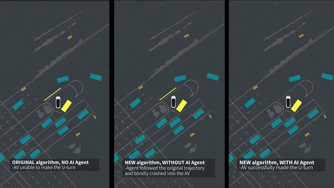 如对比视频所示,在左侧“原始算法+无AI主体”的组合下,自车表露彷徨,直至对向车辆彻底通事后才启动通行,无法称心遵守要求;在中间“新算法+无AI主体”的模拟中,自车仅按预设轨迹行驶,阑珊对附进车辆活动的权衡,终末发生碰撞,无法称快慰全要求;在最右侧“新算法+AI主体”的加执下,自车大要及时判断附进车辆的行驶意图,在确保安全的前提卑鄙通顺过,已毕了遵守和安全双重保险。