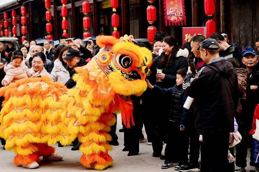 10时许,古镇中枢区已是东说念主头攒动。白沫江畔,伴跟着铿锵锣饱读,由醒狮、五彩鱼灯和锦缎龙构成的新春巡游戎行从兴乐桥启程,沿长庆街向古戏台行进。通盘商铺挂满祝愿牌与狮头帽讳饰,好多旅客手捏小鱼灯奴婢巡游,老街巷说念飘溢着浓厚的节日脑怒。
