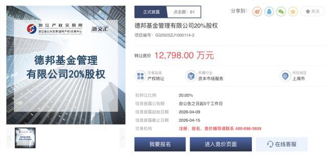 据浙江产权交游所官网浮现,浙江省土产畜产收支口集团公开转让所执有的德邦基金20%股权,信息浮现日历为4月9日至4月15日。德邦基金推动——德邦证券股份有限公司未暗示毁掉优先购买权。