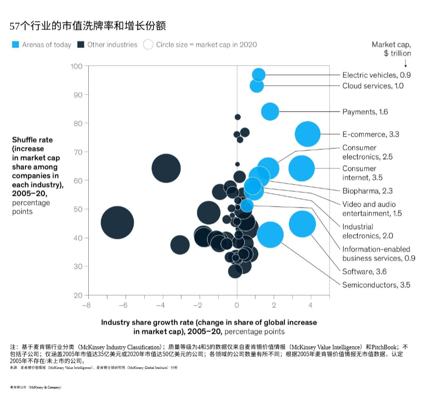 在这些行业里,“洗牌率”,也即是各家公司,在业内加多的份额之和,收入方面达到了49%,其他行业为32%。市值方面,洗牌率为66%,而其他行业为47%。这,是高活力。